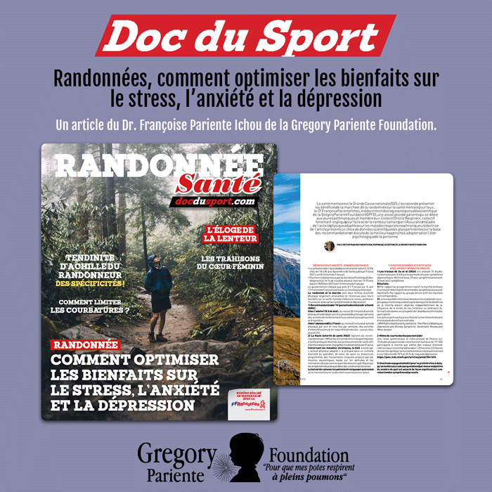 C’est le sujet proposé au Dr. Françoise Pariente Ichou de la Gregory Pariente Foundattion (GPFD) par Muriel Hatem, Directrice de la Publicité et du Développement de la revue DocDuSport et ici dans un numéro spécial "Randonnées Santé".