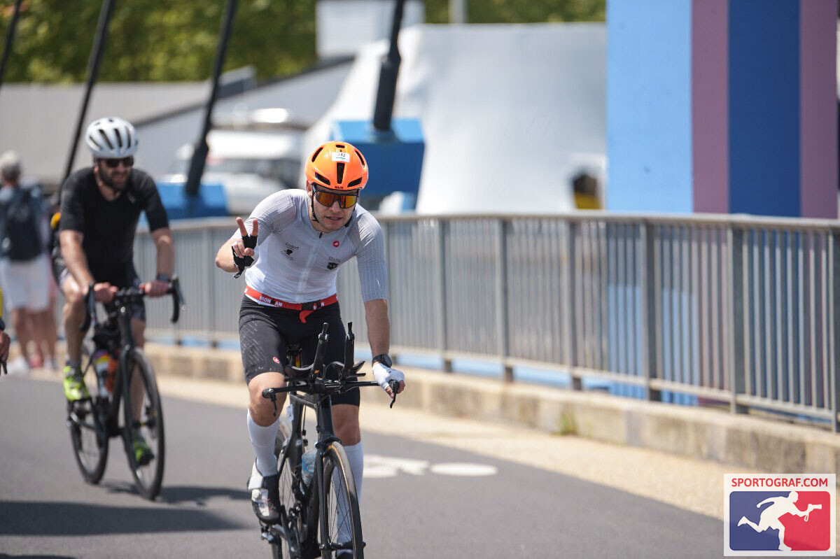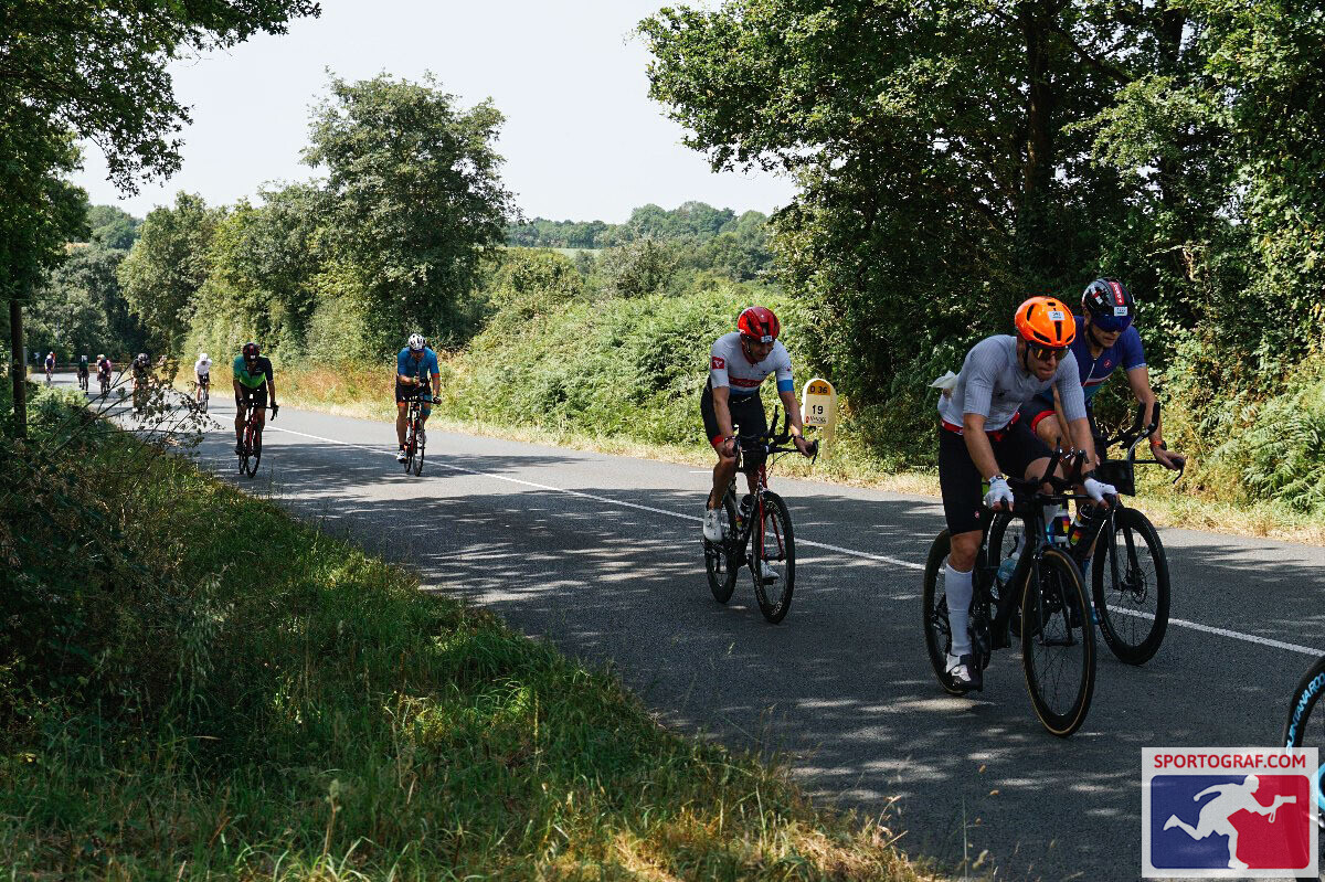 "Une fois sorti de l’eau, je retire rapidement le haut de ma combinaison pour uriner dedans sous les jets d’eau, avant d'entrer dans le parc à vélo. Une fois prêt, direction le sac de transition pour trouver mon peigne et me recoiffer. Comme d'habitude, je prends mon temps et je ferai cette T1 en un peu plus de 10 minutes. Mais je me rends compte que je suis un peu juste au niveau de la respiration pour faire les 100 prochains kilomètres de vélo (le ravitaillement personnel était prévu au 101e kilomètre et j’avais prévu d’en profiter pour reprendre de la ventoline), donc je décide de reprendre une bouffée. Casque vissé sur la tête et lunettes de vitesse sur le nez, je trottine vers mon vélo pour prendre la route des Chouans."