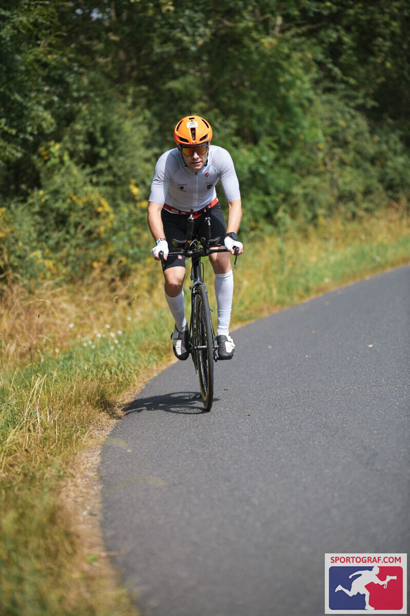 "Au kilomètre 101, je m’arrête donc 8 minutes sous la tente pour prendre un peu d’ombre, manger mon sandwich et reprendre de la ventoline. Je repars frais dans la côte (les organisateurs avaient positionné ce ravitaillement au début d'une bosse), avec des patates et des bretzels dans les poches, ainsi qu'un bidon d'isotonique plein. Je maintiens une allure de 33 km/h sans pour autant me mettre dans le rouge. Je sens que cette sortie longue va bien se passer ! Et puis patatras, les vieux démons reviennent et je commence à avoir des crampes dans tous les orteils au km 145. Je n'avais pas voulu modifier mes cales dans les semaines précédentes, et c'était une grosse erreur. Je passe 35 kilomètres avec un mal de chien dans les deux pieds, j'ai mal quand j'appuie et encore plus quand je ne pédale pas. Je me dis que ce n'est que de la douleur, et je pense à Geo et à son épaule. Je sais ce que c'est, et je ne peux rien y faire. Je continue donc, mais je perds clairement des positions que je n’aurais jamais perdues sans ce petit pépin. Je compte les kilomètres, j’en peux plus, et je ne profite pas des 15 derniers kilomètres en faux plat descendant avec le vent dans le dos."