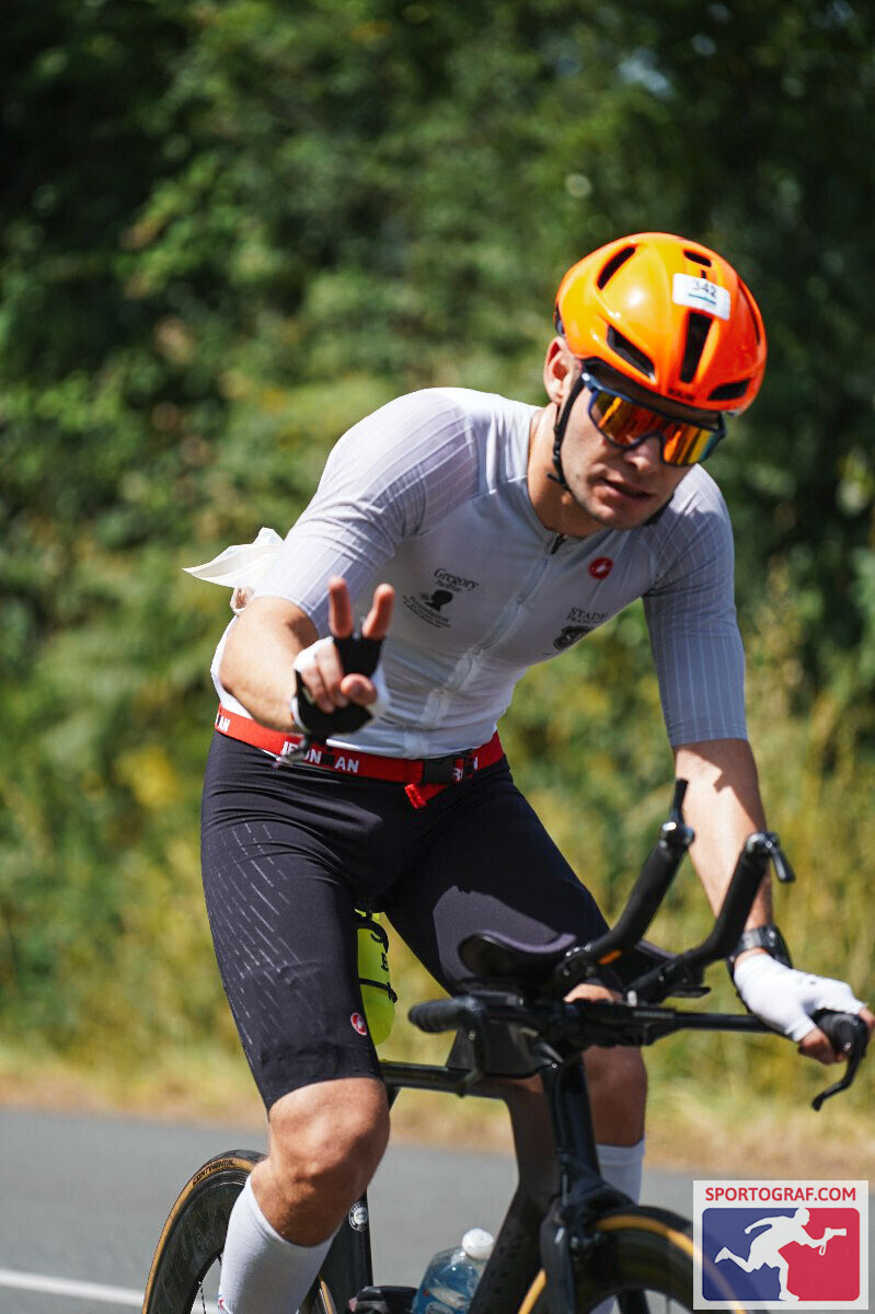 "Il y a un monde fou dès la sortie du parc à vélo. Les premiers supporters du SFT sont là, ce qui rend les choses encore plus folles. Je pars sur un bon rythme, je me sens bien. Mais je sais qu'il faut que je fasse attention sur les 20 premiers kilomètres, car j'ai le vent dans le dos, donc je ne dois pas m'emballer. Et puis, mes parents m'attendent au kilomètre 22, donc je dois être en pleine forme. Il y a un faux plat de 5 km entre le 15^e et le 20^e kilomètre, je ne le vois même pas, les sensations sont folles. La trifonction est un régal et j’ai le cul dans du coton."