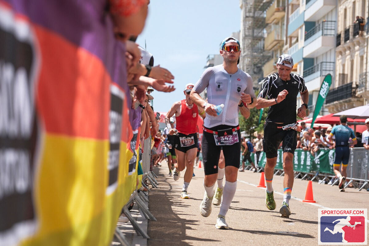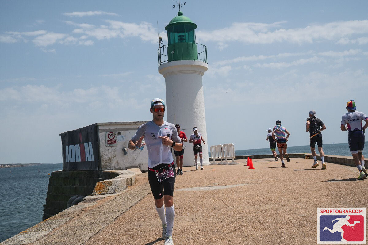"Il n'est que 14h30, mais j'ai un marathon à commencer. Et pour cela, il faut que je me prépare. La T2 se fait donc aussi tout en douceur. Après être descendu du vélo, j'ai du mal à marcher à cause de mes crampes. Il me faut presque 9 minutes pour étirer mes orteils, boire, m'alimenter, me rafraîchir et surtout reprendre deux bouffées de Ventoline avant la course à pied. En posant le vélo, je sais que je serai Ironman. Mes parents m’attendent à la sortie de la T2 ; je m’arrête pour les embrasser tous les deux. À part les crampes aux orteils, je me sens bien physiquement et je sais qu’elles vont vite disparaître dans les premiers kilomètres. Je pars confiant, en me disant que j’ai pris 10 à 15 minutes d’avance sur le plan initial malgré les 35 derniers kilomètres compliqués, et que le marathon en 4 h 30, comme prévu, est à ma portée. Je décide donc de partir à un rythme légèrement plus rapide de 6 min/km (soit un marathon en 4 h 13), comme je l'ai décidé après les discussions des derniers jours avec mes amis qui me disaient que l'allure pour 4 h 30 n'était pas assez ambitieuse avec une EF à 5 min 35 s/km, et que si je partais à 6 min 30 s/km pour exploser de toute façon au 30ème km, je m'en voudrais de ne pas avoir tenté une allure plus rapide avant."