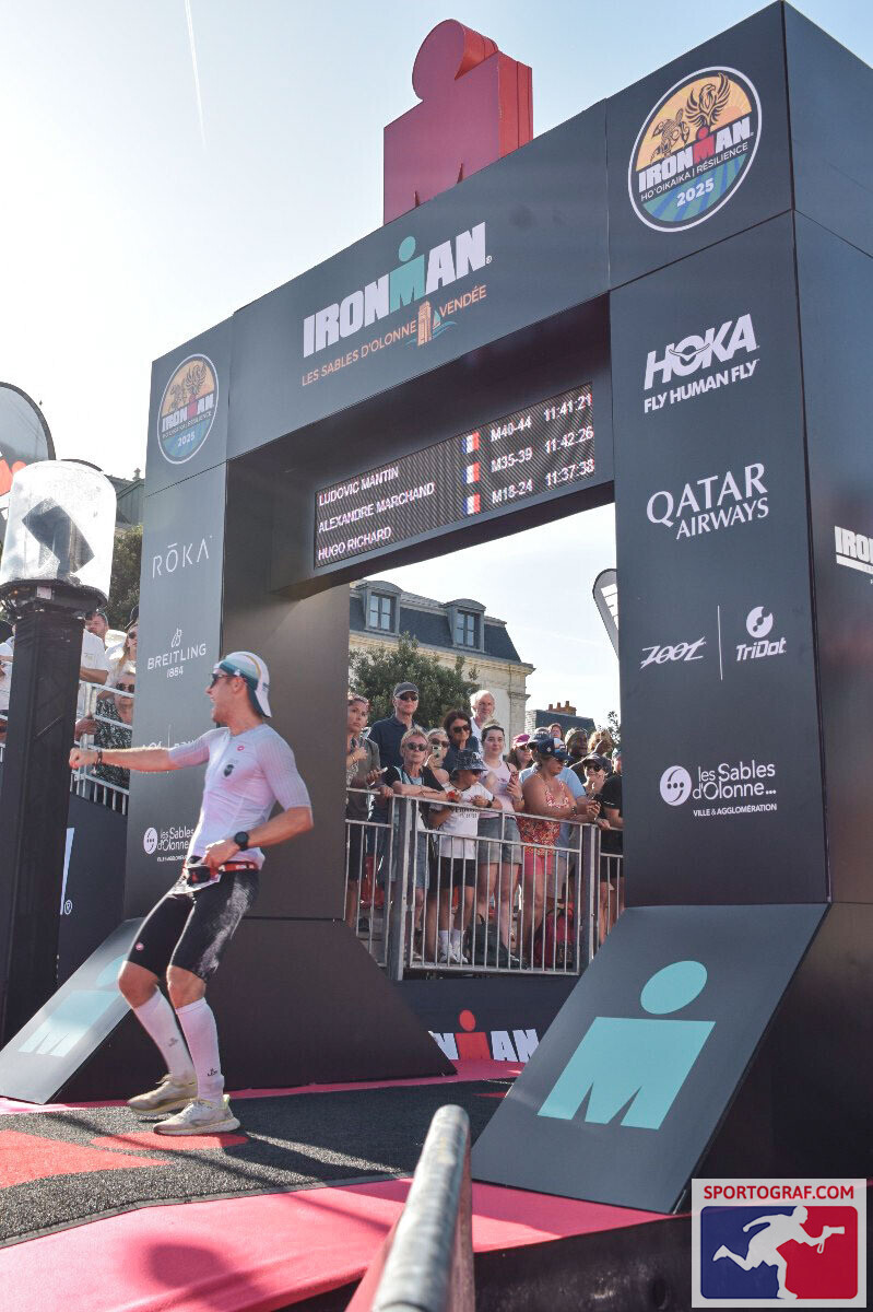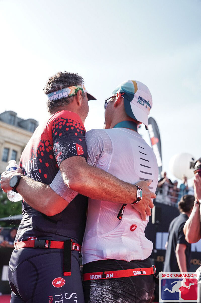 "Le speaker présente le projet et demande à tout le monde de faire un big up, c’est trop stylé. Un bénévole me met la médaille autour du cou, et là, toute l’émotion me submerge. Je réalise ce que je viens de faire, et je suis tellement heureux d’avoir maintenant ce magnifique message à transmettre à tous les asthmatiques. Mon père est là, juste derrière les barrières, et je l'embrasse fort. Le moment est indescriptible. Je sais que David, mon ami, est quelques minutes derrière moi et je décide de l’attendre pour le voir franchir lui aussi cette arche mythique pour la première fois. J’ai donc quelques minutes pour réaliser, être ému et rester dans l’ambiance de cette ligne d’arrivée. David franchit la ligne et c’est peut-être le moment le plus émouvant de la journée. Je suis tellement fier de le voir arriver au bout de son rêve. On se prend dans les bras pendant de longs instants. Cette émotion est inégalable, indescriptible, bordel que c'est bon et beau ! Et le plus beau, c’est que je me sens bien, pas cassé du tout. J’ai déjà envie de m’aligner sur mon prochain IM avec vous, les copains!."