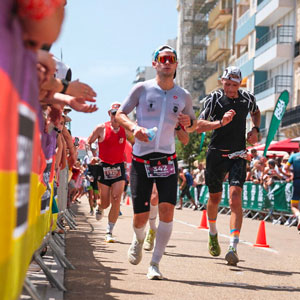 "Il n'est que 14h30, mais j'ai un marathon à commencer. Et pour cela, il faut que je me prépare. La T2 se fait donc aussi tout en douceur. Après être descendu du vélo, j'ai du mal à marcher à cause de mes crampes. Il me faut presque 9 minutes pour étirer mes orteils, boire, m'alimenter, me rafraîchir et surtout reprendre deux bouffées de Ventoline avant la course à pied. En posant le vélo, je sais que je serai Ironman. Mes parents m’attendent à la sortie de la T2 ; je m’arrête pour les embrasser tous les deux. À part les crampes aux orteils, je me sens bien physiquement et je sais qu’elles vont vite disparaître dans les premiers kilomètres. Je pars confiant, en me disant que j’ai pris 10 à 15 minutes d’avance sur le plan initial malgré les 35 derniers kilomètres compliqués, et que le marathon en 4 h 30, comme prévu, est à ma portée. Je décide donc de partir à un rythme légèrement plus rapide de 6 min/km (soit un marathon en 4 h 13), comme je l'ai décidé après les discussions des derniers jours avec mes amis qui me disaient que l'allure pour 4 h 30 n'était pas assez ambitieuse avec une EF à 5 min 35 s/km, et que si je partais à 6 min 30 s/km pour exploser de toute façon au 30ème km, je m'en voudrais de ne pas avoir tenté une allure plus rapide avant."